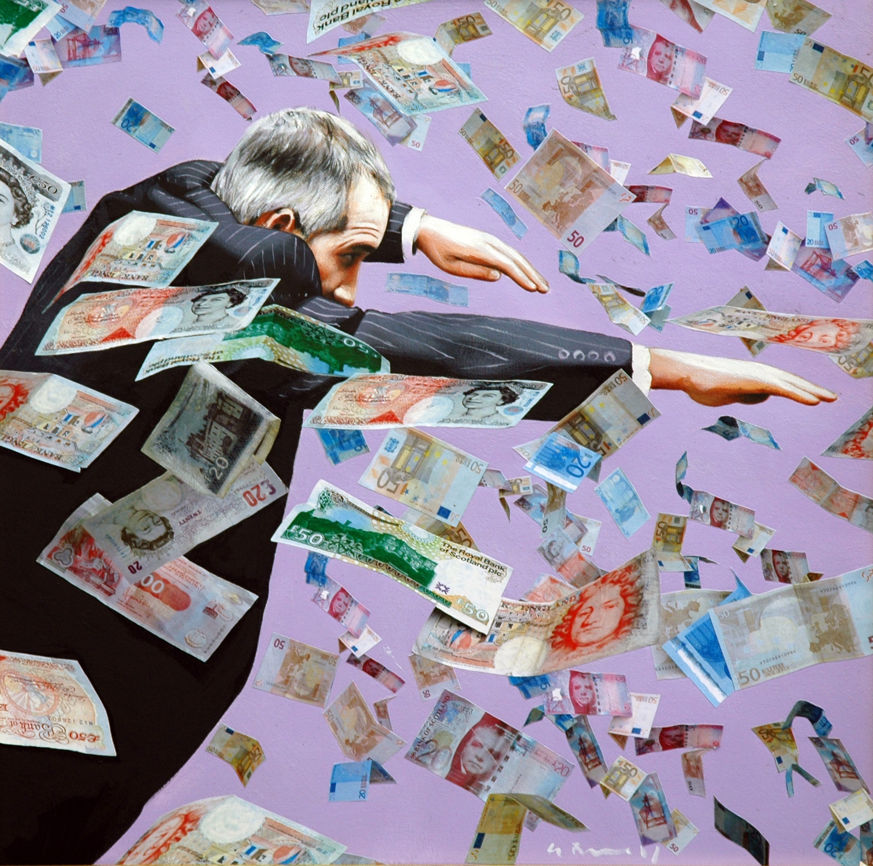 ‘The paintings were intended as a metaphor for the lives I saw around me, so much opportunity, so many hopes and dreams…. but disaster was always just a slip away. In these paintings I first understood however that what the viewer receives is not necessarily always what the artist intends. In my own mind I intended these to be literally ‘balancing acts’, which were a comment on the precariousness of the lives I saw around me at that time. However for many people they symbolised other things, “release’ so that the figure rather than being balanced in the middle of the storm cloud of notes is instead actually throwing the notes…..for theres it actually represented a ‘Letting go” perhaps echoing their own lives at the point of retirement.
