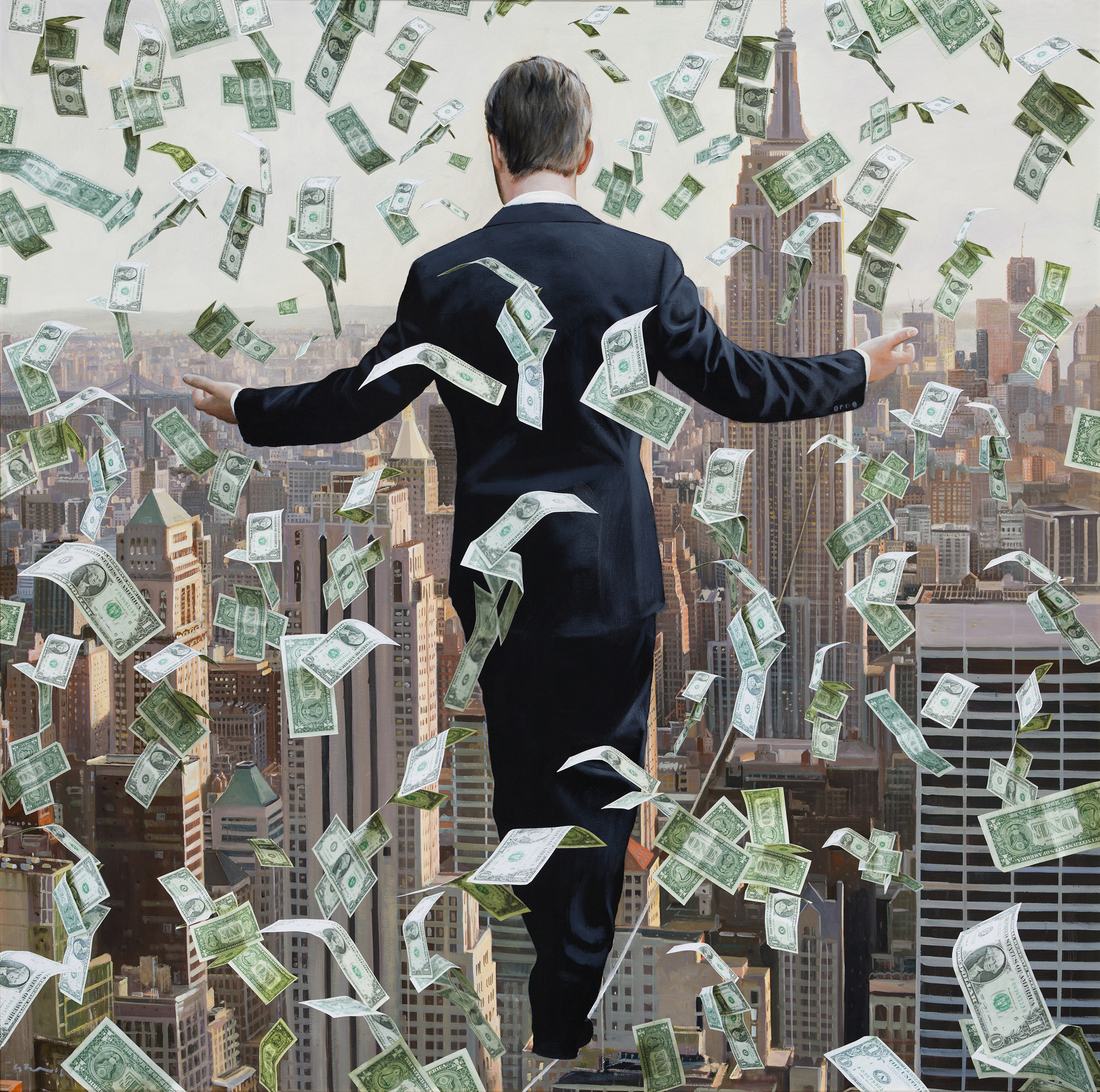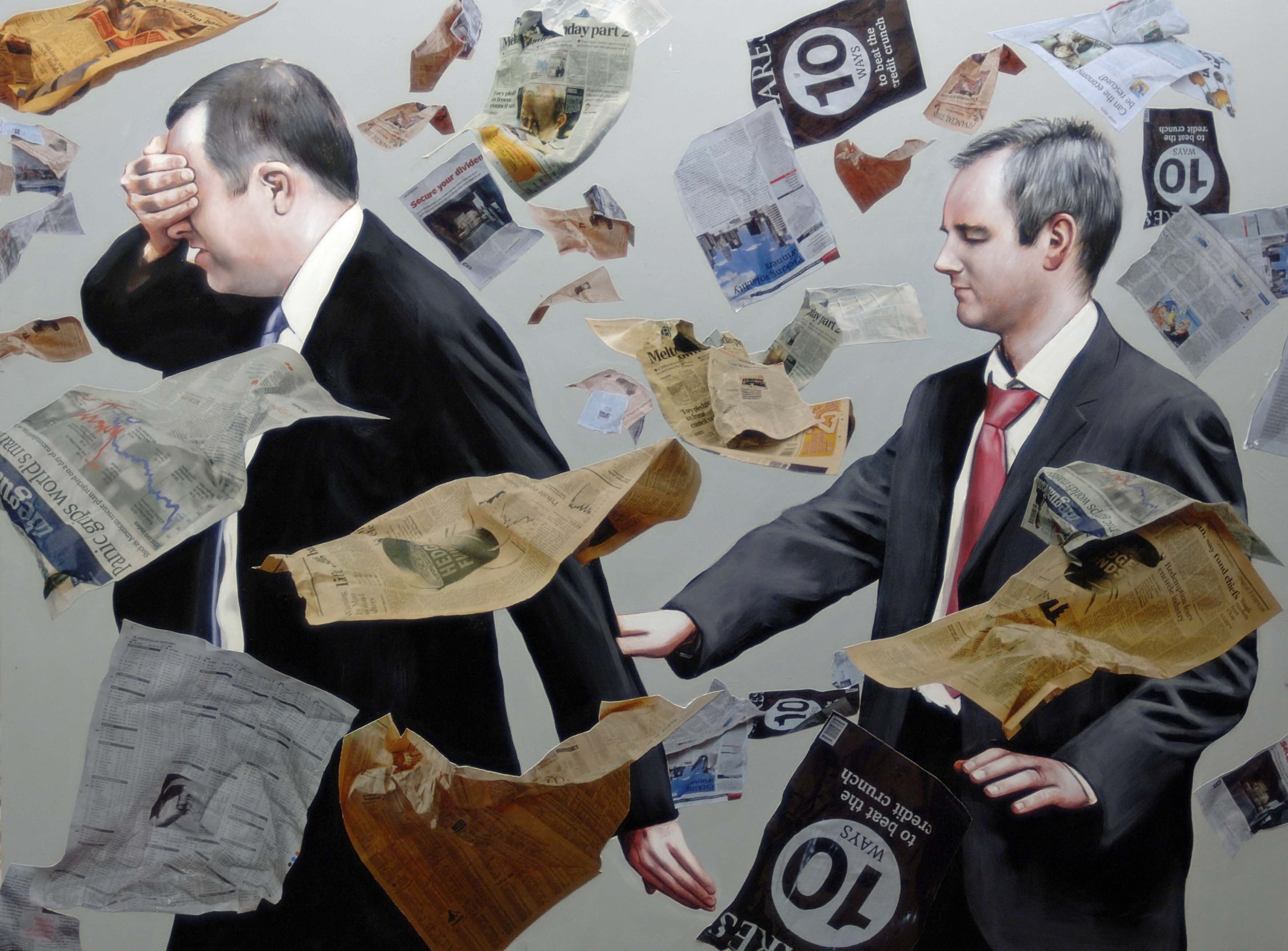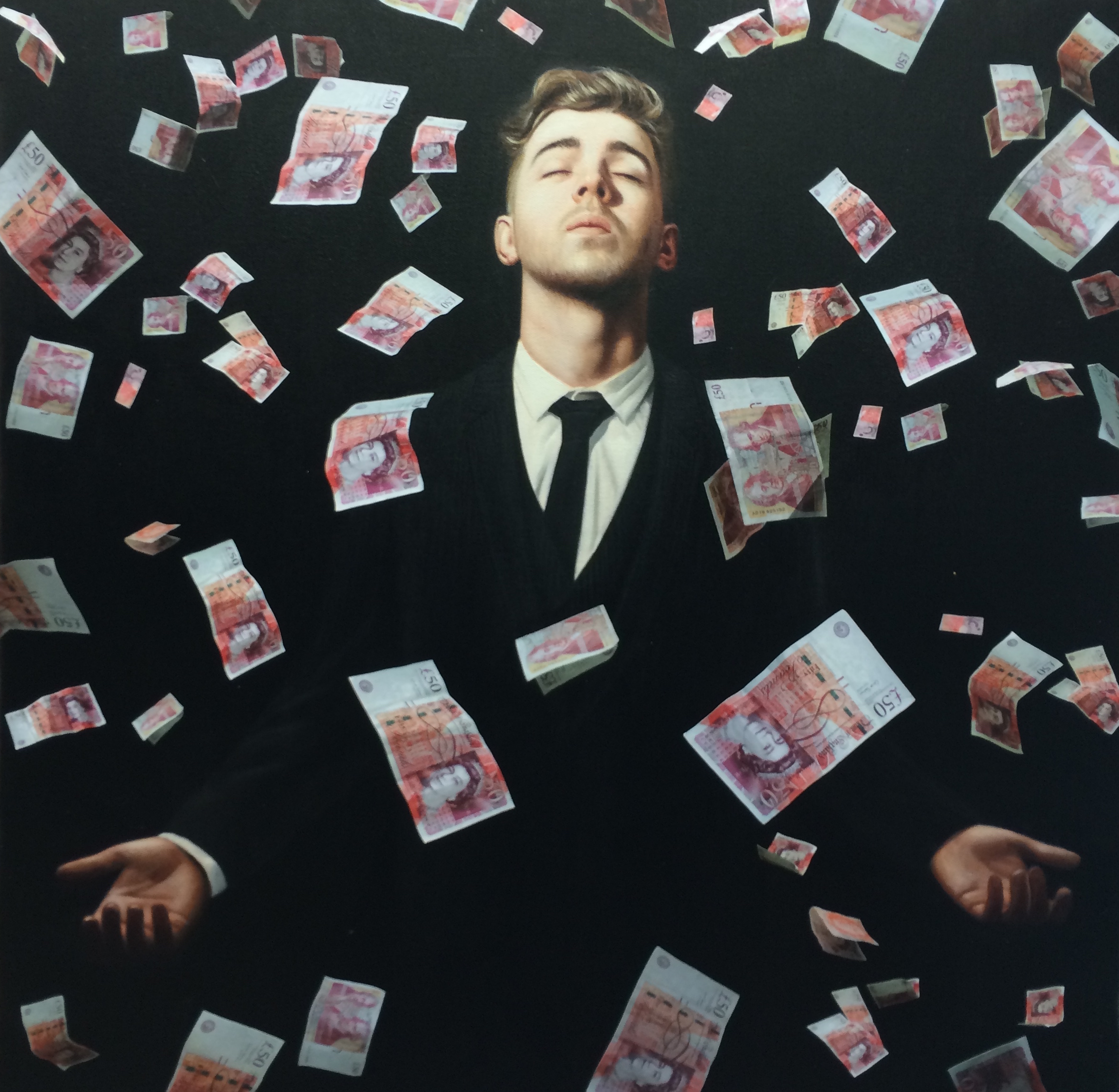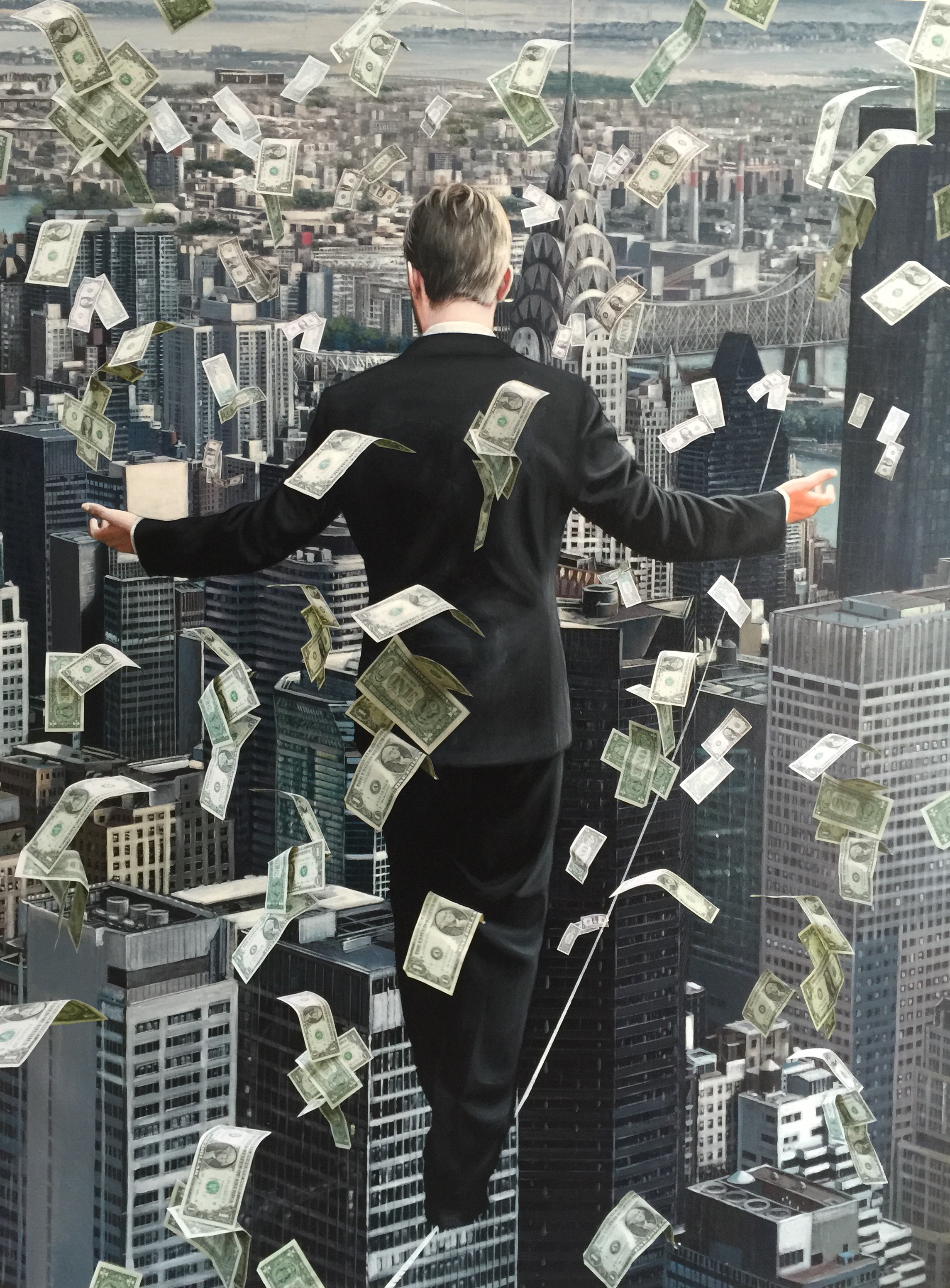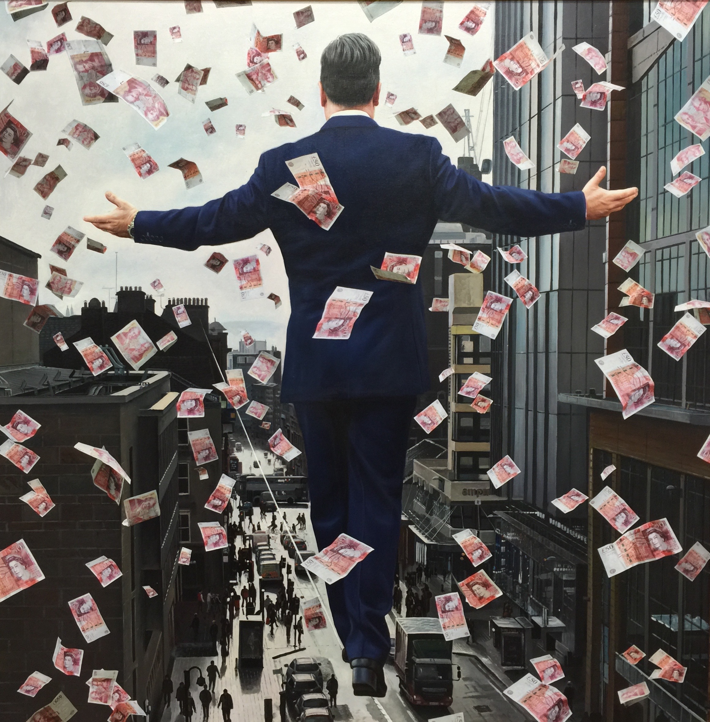 A man suspended high above the city, arms outstretched with palms either facing up or down… balanced precariously on a high-wire with bank notes swirling around. Not perhaps the most obvious subject matter but in Burns’ hands these elements are skilfully woven together to create a narrative which is a comment on our times…