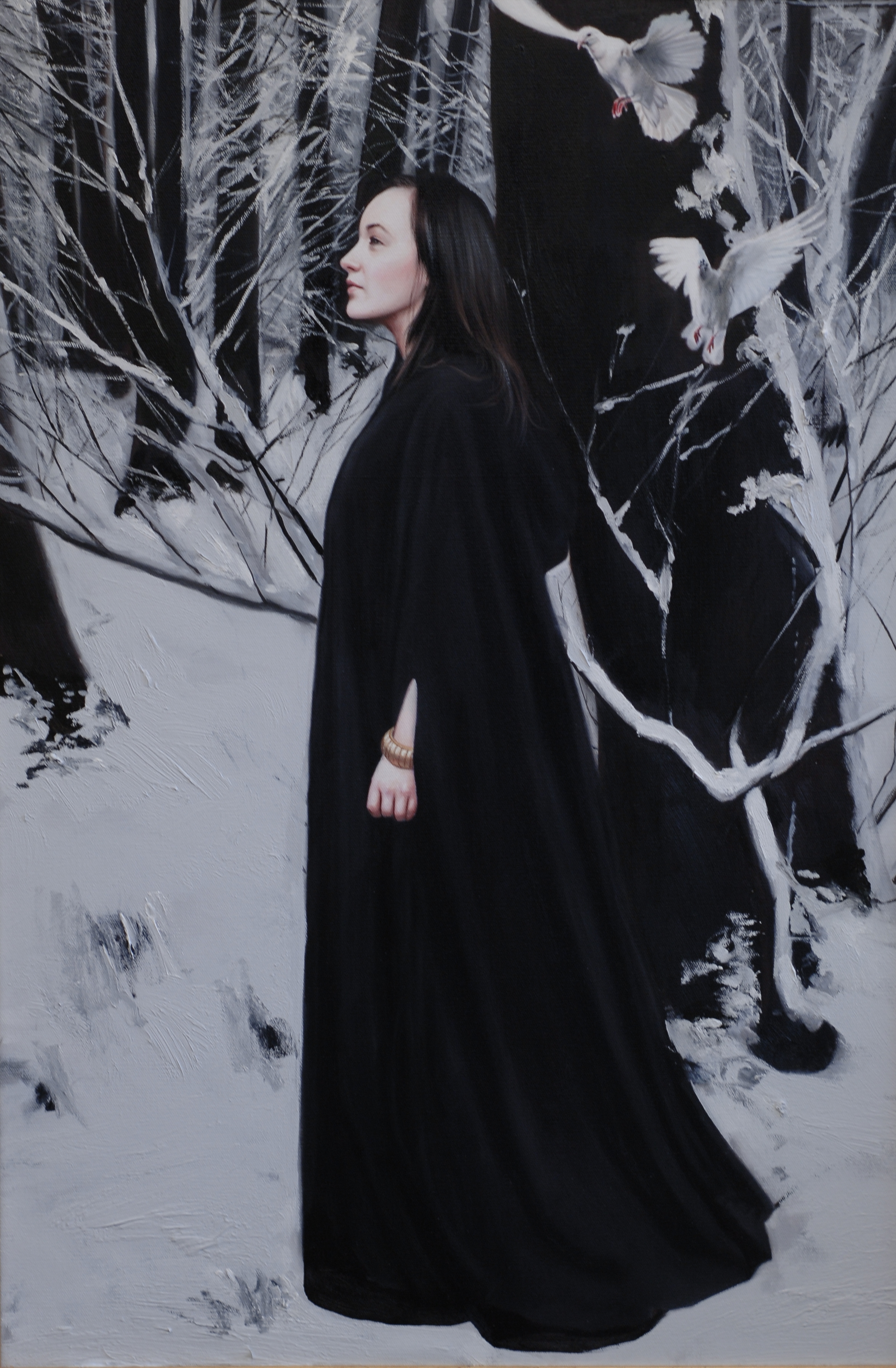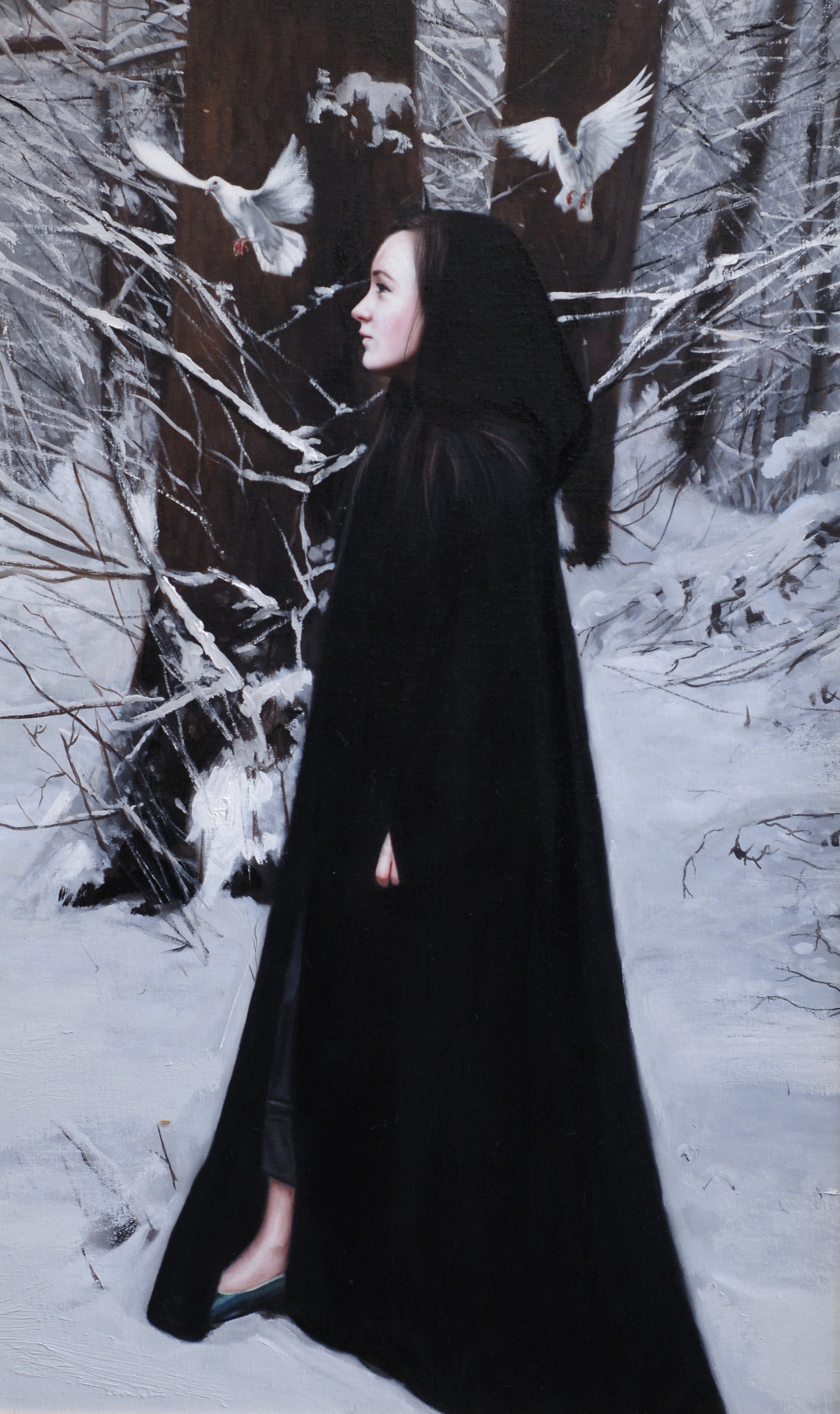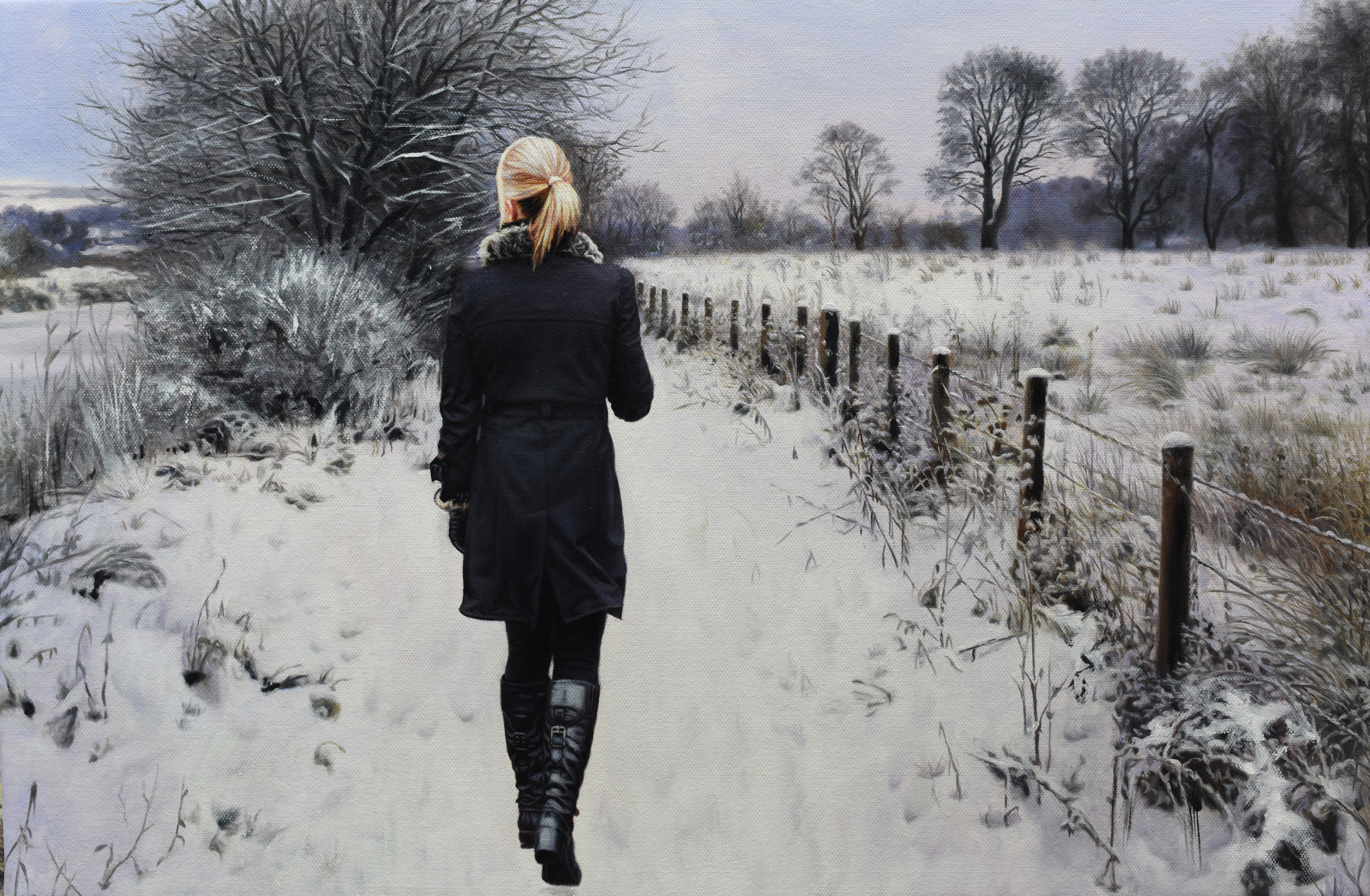Snow and the backdrop of snow symbolically represents purity and in many Pictish texts suggests a landscape of the mind. In Burns’ work figures are placed within this context deliberately to invoke in us an emotional response. There is in all of these paintings a sense of narrative, a sense that we are simply scratching the surface in some greater story, that we are being presented with a moment in time or a snapshot of some ongoing journey.