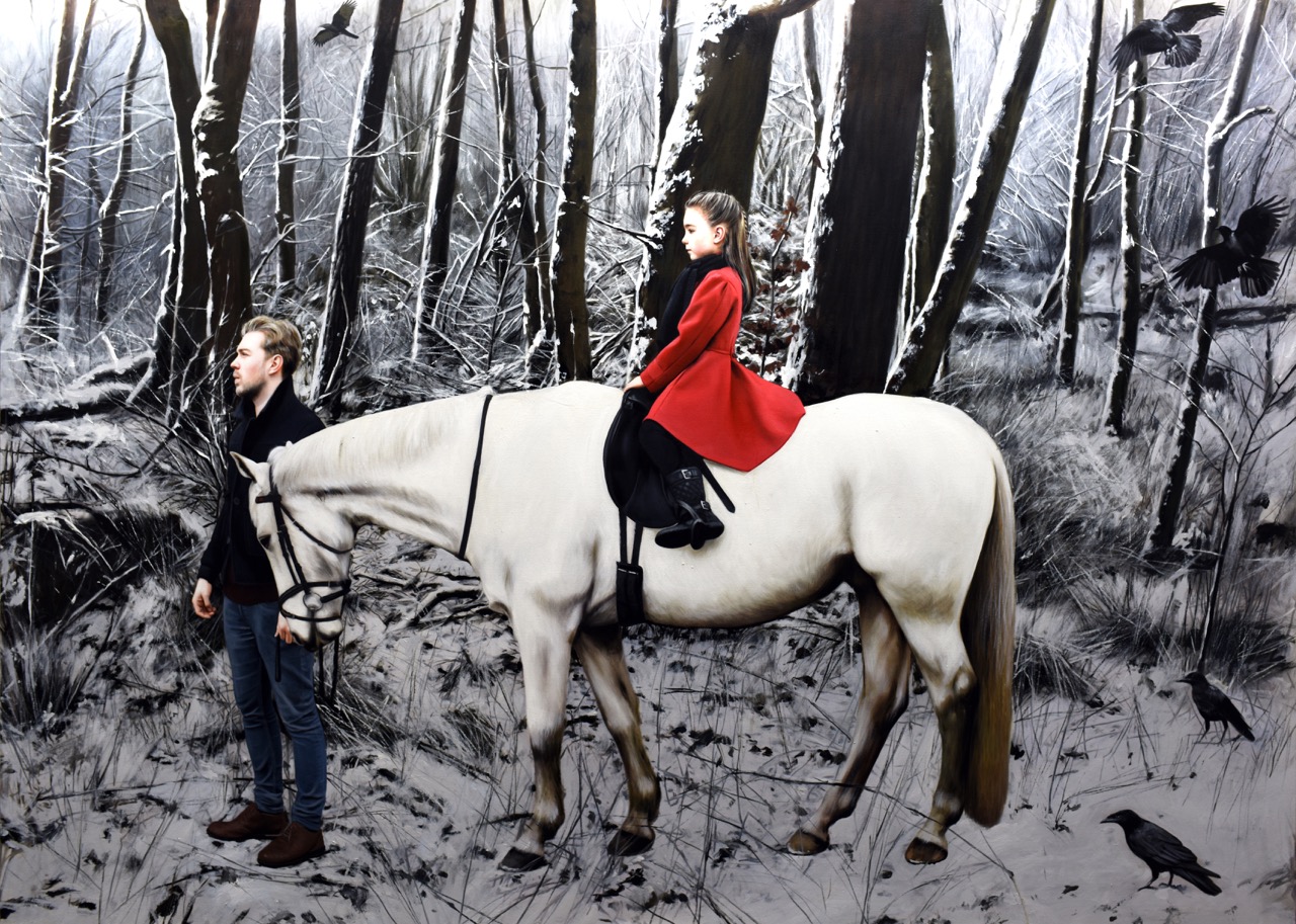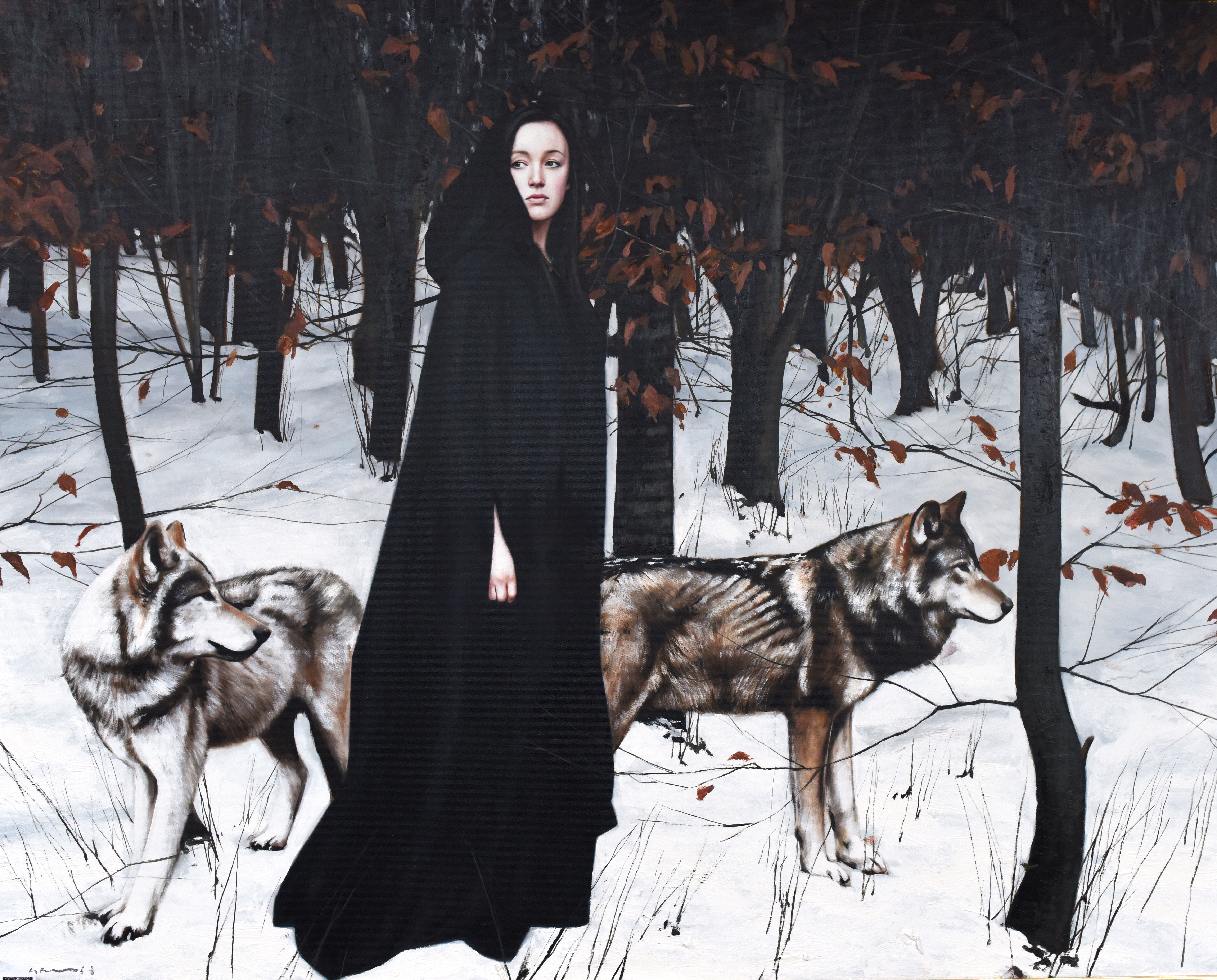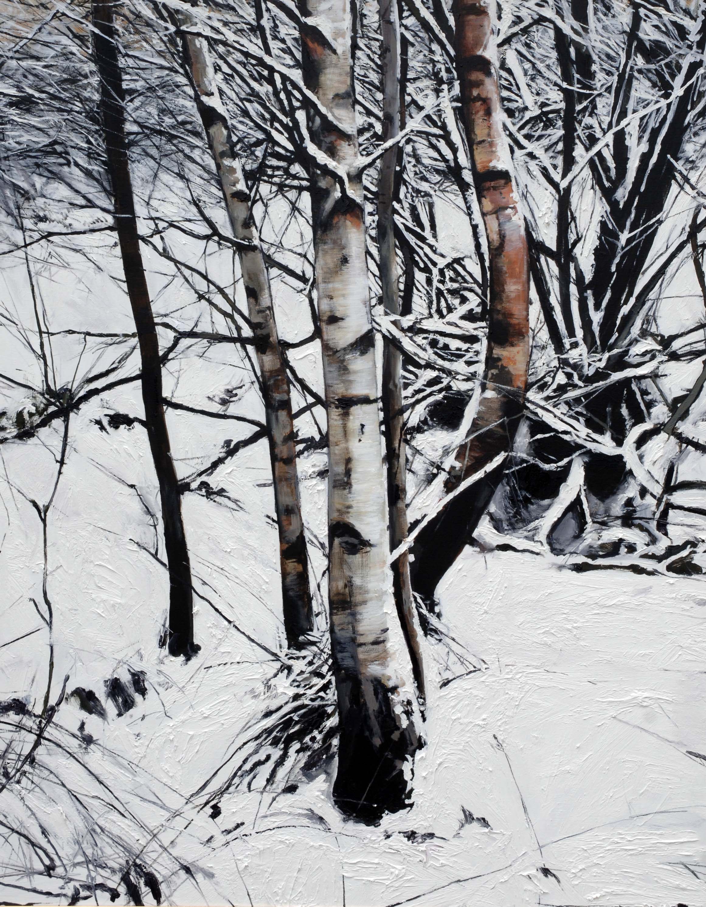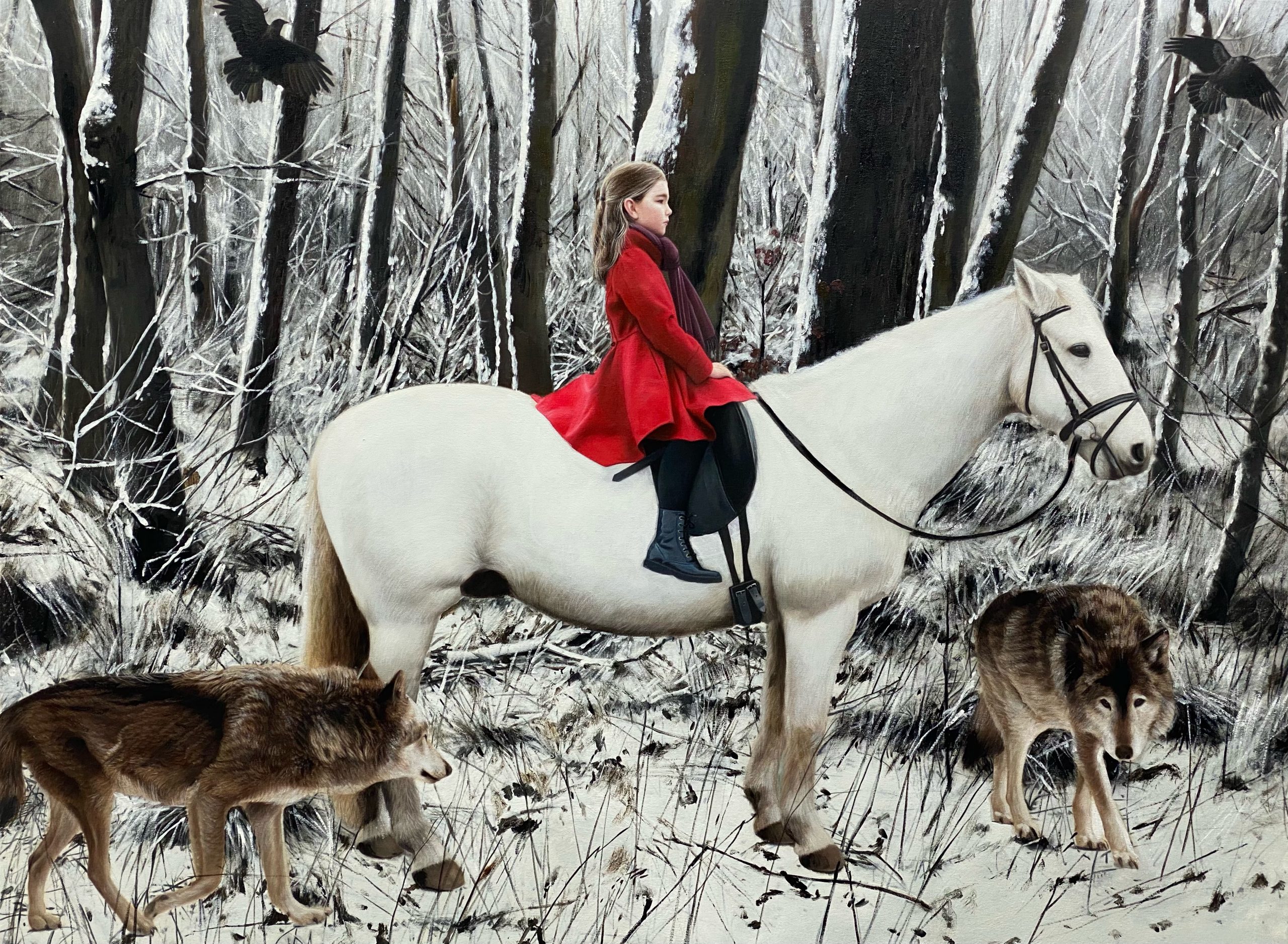 Snow and the backdrop of snow symbolically represents purity and in many Pictish texts suggests a landscape of the mind. In Burns’ work figures are placed within this context deliberately to invoke in us an emotional response. There is in all of these paintings a sense of narrative, a sense that we are simply scratching the surface in some greater story, that we are being presented with a moment in time or a snapshot of some ongoing journey.
