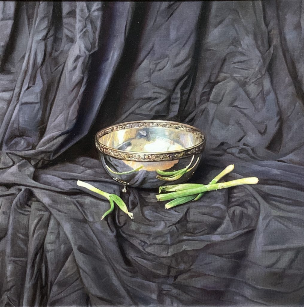 Still life with silver bowl and three spring onions [0424] (50x50cm) - £2,500
