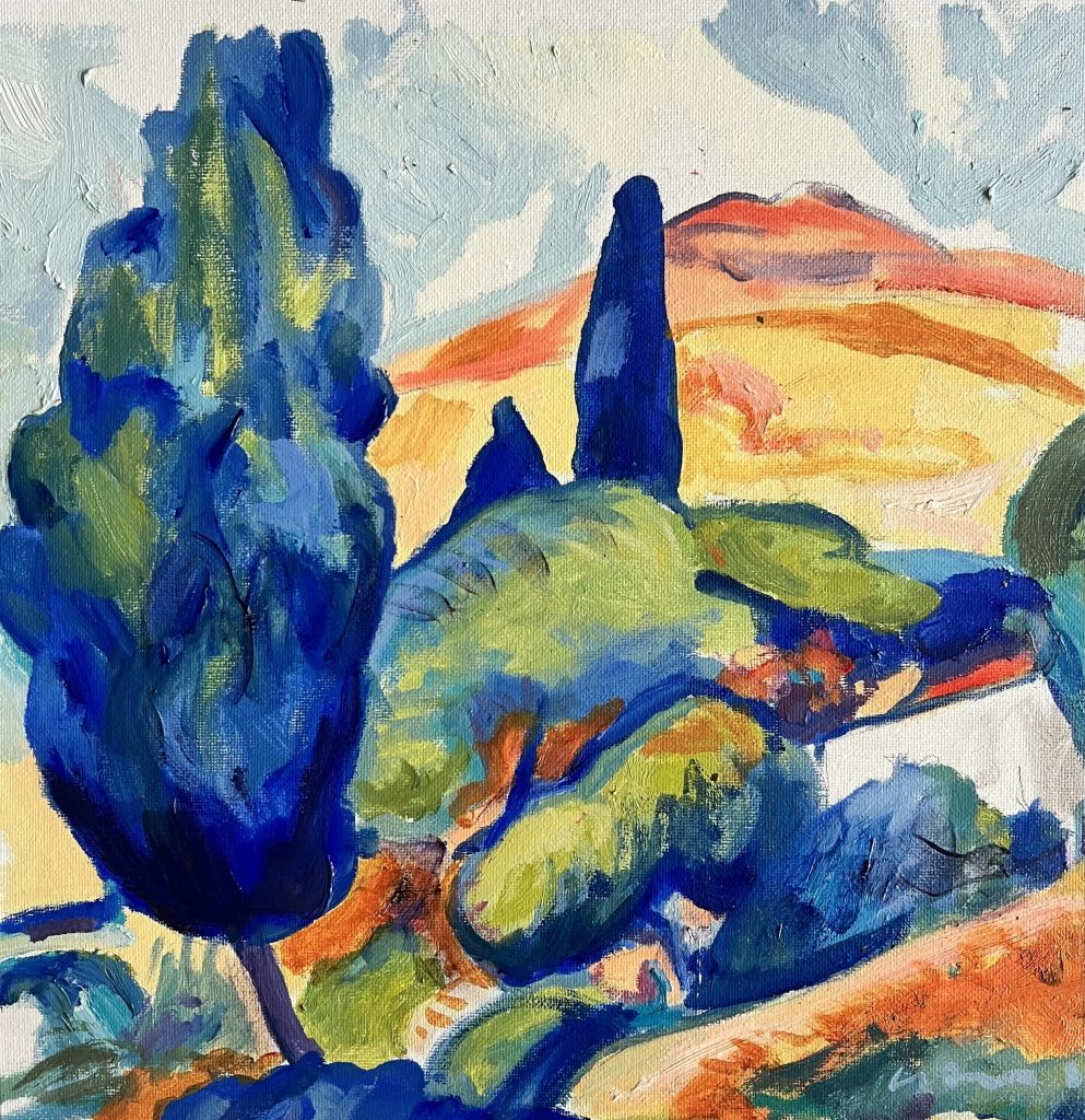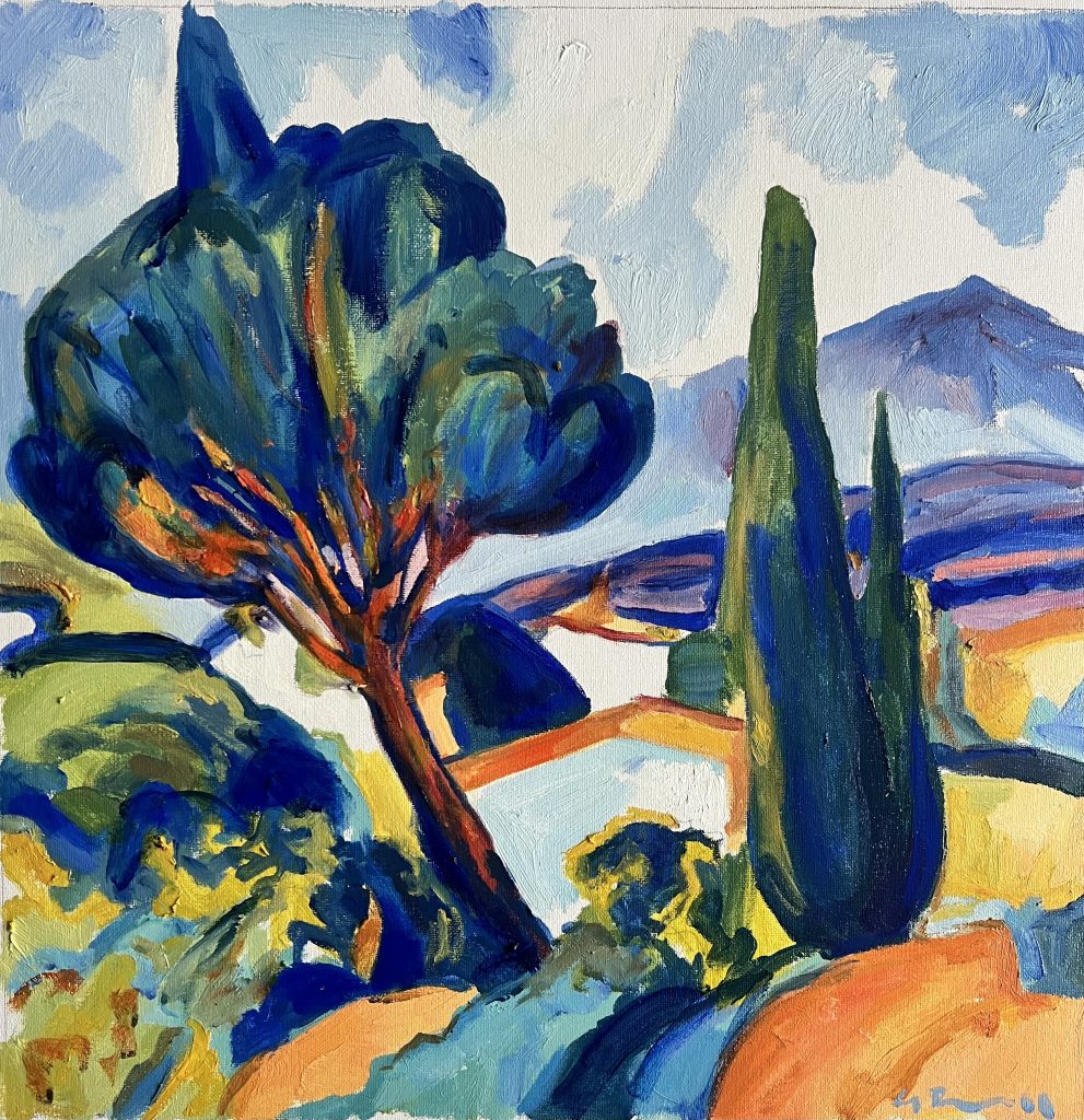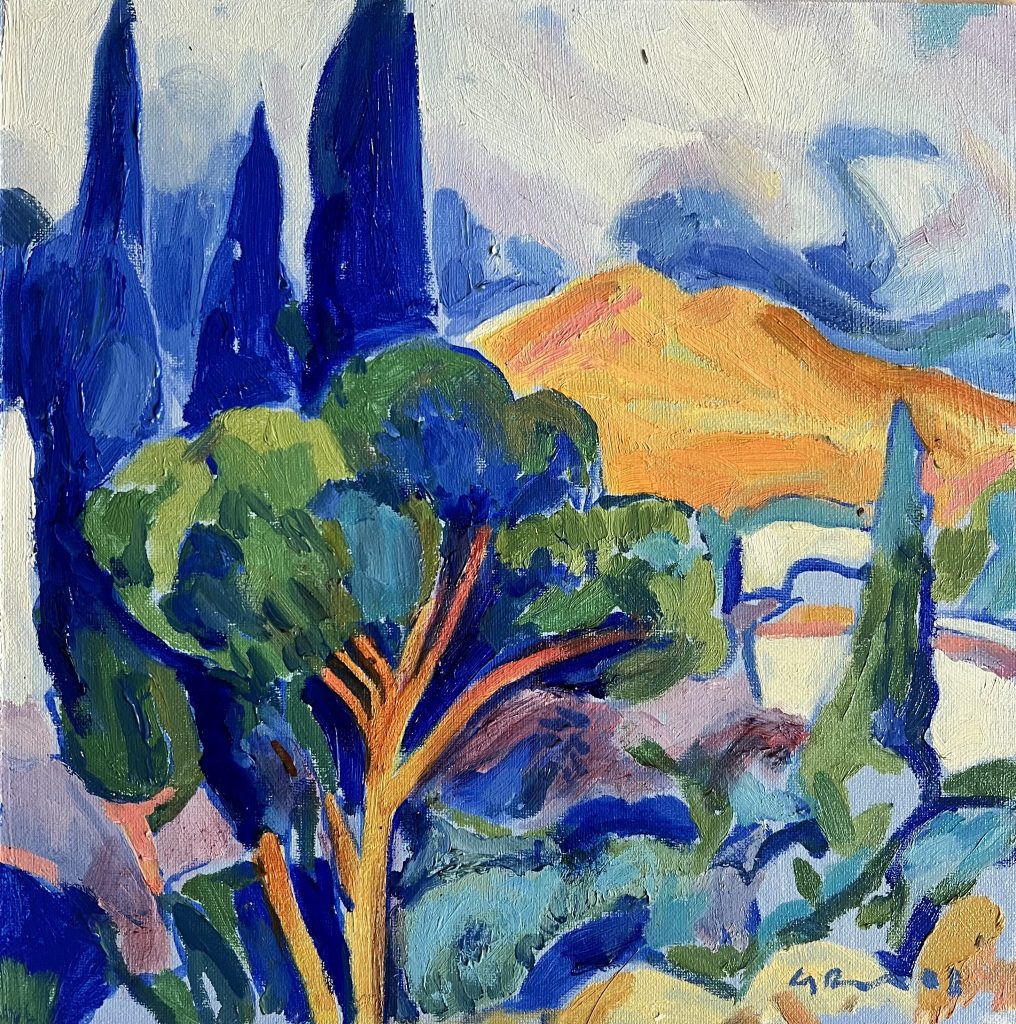 Cypress Trees and Blue Hills [0786] (40x40cm) - £1950